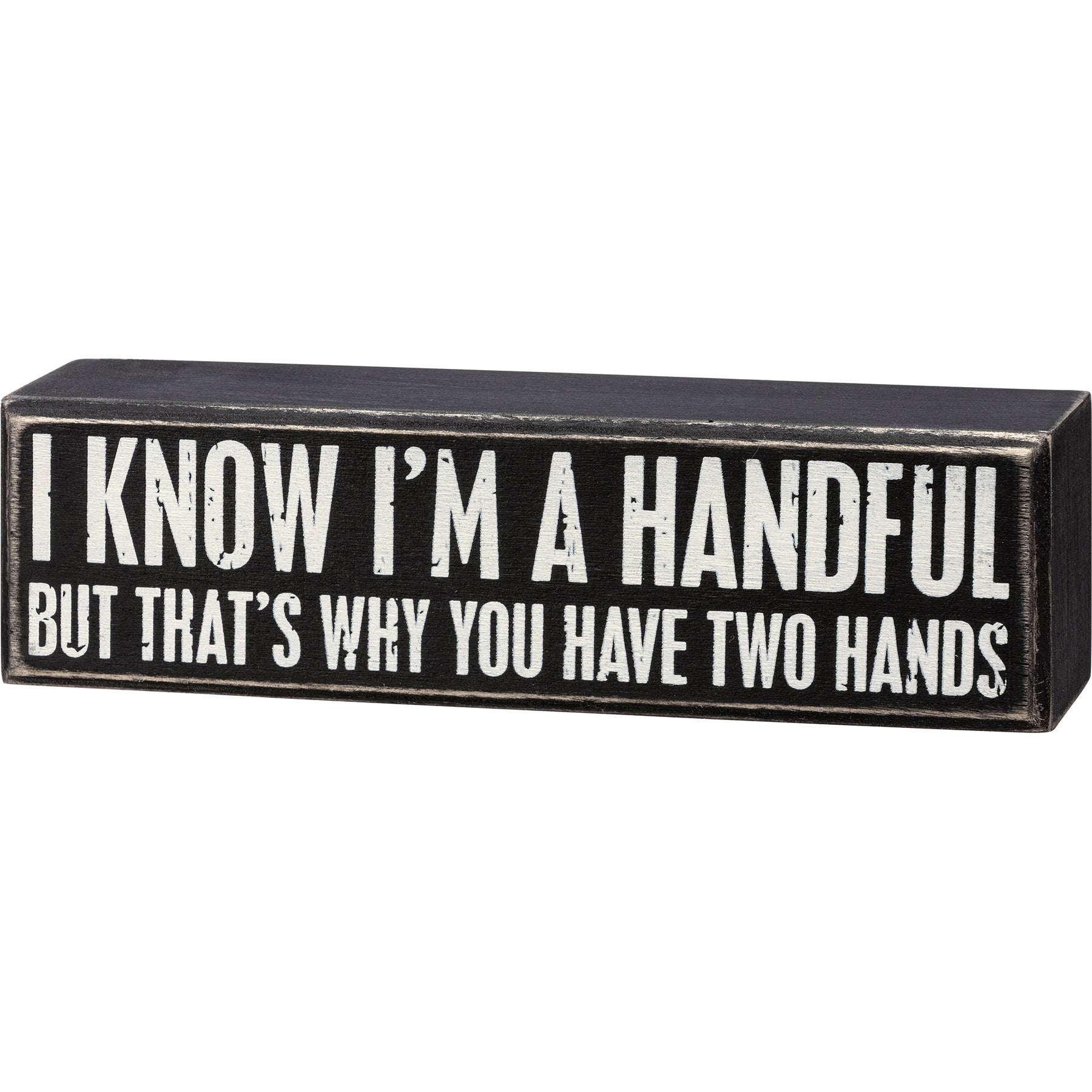 A classic black and white wooden box sign featuring a distressed "I Know I'm A Handful But That's Why You Have Two Hands" sentiment. Our I Know I'm A Handful sign is easy to hang or can free-stand alone.